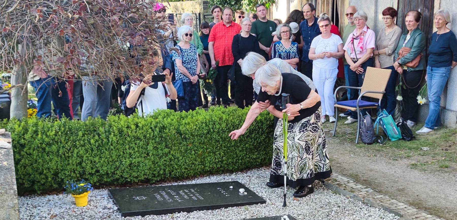 Pfarrerin Cornelia Roßner sprach an den Gräbern und zitierte den Holocaustüberlebenden und späteren Friedensnobelpreisträger Elie Wiesel: „Jeder, der heute einem Zeugen zuhört, wird selbst ein Zeuge werden.“ Und weiter: „Heute ist so ein Tag, an dem wir genau das erleben, denn wir durften ihnen zuhören, liebe Frau Tischler“.